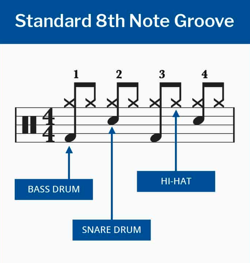 The final part of this groove is the 8th notes which drummers typically play on the hi-hat cymbal.